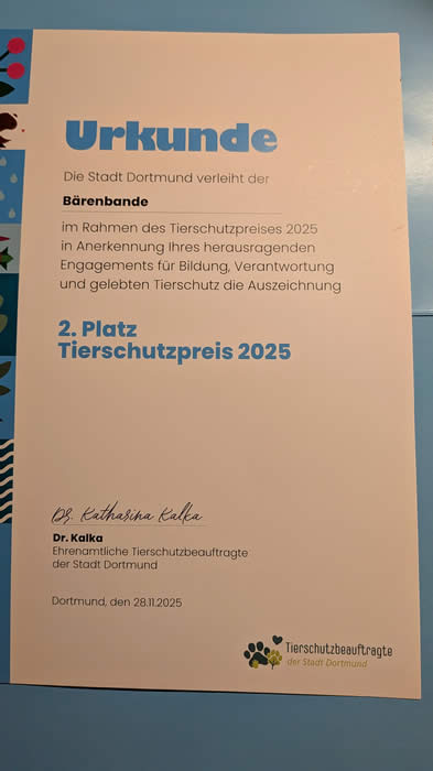 Zum zweiten Mal wurde in diesem Jahr der Tierschutzpreis der Stadt Dortmund vergeben - eine Initiative der Tierschutzbeauftragten, um Projekte zu würdigen, die sich im Tierschutz engagieren. In diesem Jahr richtete sich die Ausschreibung an Kinder und Jugendliche, die sich in der Schule, in Vereinen oder auch privat für Tiere einsetzen. Wir sind wahnsinnig stolz, den 2. Platz erreicht zu haben. Danke für die tolle Würdigung unserer Arbeit und herzlichen Glückwunsch an die anderen Preisträger mit ihren tollen Projekten. Zusammen werden wir überlegen, wie wir das Geld am sinnvollsten einsetzen. (Fotos: Roland Gorecki)