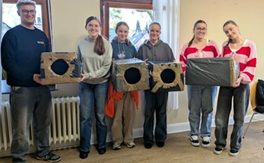 Die vor zwei Wochen gebauten Häuser kriegen noch einen tier- und naturfreundlichen Schutzanstrich, um sie auch dauerhaft draußen aufstellen zu können. Ob in Naturfarben oder bunt - der Kreativität werden keine Grenzen gesetzt. Ein Dach aus Teerpappe hält auch von oben alles schön dicht. Eine Trennwand im Inneren schützt auch noch z.B. vor Katzen.